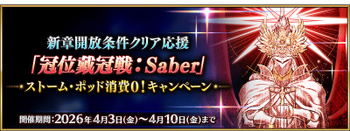新章开放条件通关应援「冠位戴冠战:Saber」风暴罐消耗0!纪念活动 |