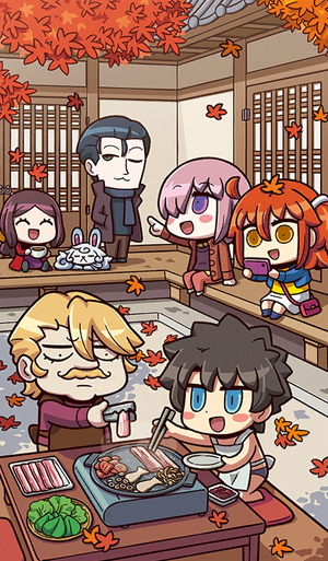 | 1. 藤丸立香(男性) ・ 2. 藤丸立香(女性) ・ 3. 戈尔德鲁夫·穆吉克 ・ 4. 玛修·基列莱特 ・ 5. 夏洛克·福尔摩斯 ・ 6. 莱昂纳多·达·芬奇(Rider) ・ 7. 芙芙 | |||